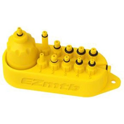 Odvzdušňovací nádobka EZmtb je určena pro hydraulické brzdy od značky Shimano. Součástí dodávky jsou i adaptéry pro různé značky brzd a stojánek.