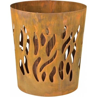 Kovové venkovní otevřené ohniště. Kruhové. Designové zpracování v hnědo-červené barvě rzi s laserově vyřezanými vzory plamenů. Není vhodné pro použití v interiéru.