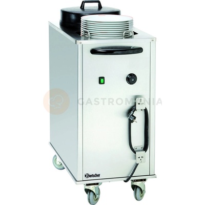 Z nerezové potravinářské oceli, teplotní rozsah: +30 až +110 °C. Kapacita: cca 2 x 50 talířů, max. o pr. 300 mm. 4 kolečka z toho 2 bržděná. Příkon: 2,0 kW/230 V. Rozměry: 430...