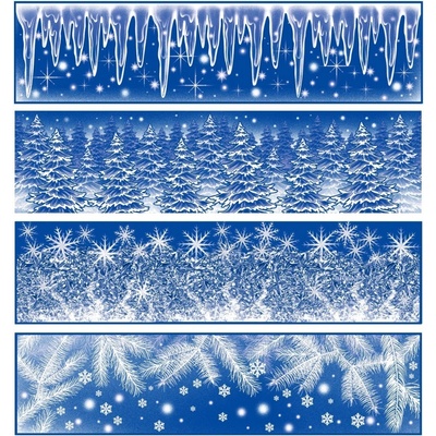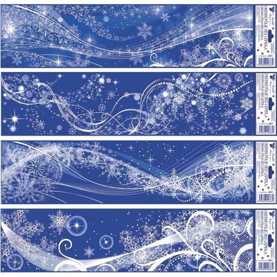 Vánoční dekorační okenní fólie pruh ledové květy, rampouchy s duhovými glitry. Elektrostaticky přilnavá fólie bez lepidla, vhodná k dekoraci oken, na kachličky, chladničku a...