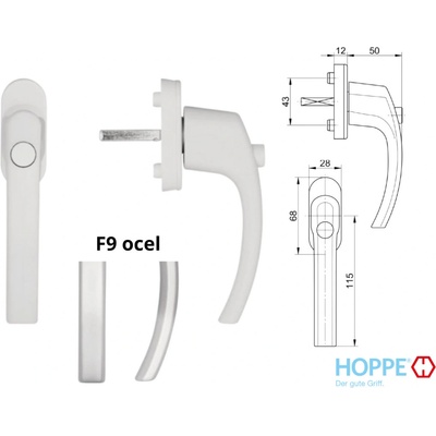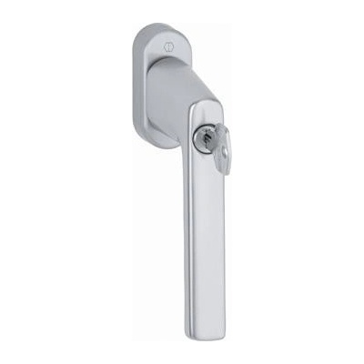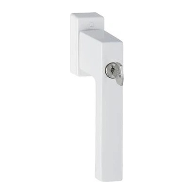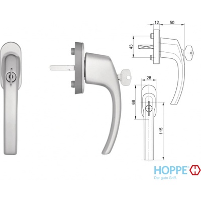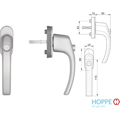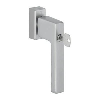 Bezpečnostní okenní klika HOPPE Tokyo uzamykatelná. - Materiál: Hliník - Rozměr čtyřhranu: 7 mm - Rozměr rozety: 29 x 66 x 13 mm - Průměr noků: 10 mm - Aretace: 45° -...