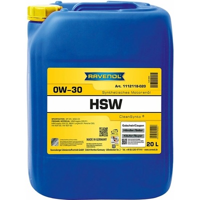 RAVENOL HSW SAE 0W-30 je syntetický motorový olej s nízkým třením s podílem PAO > 30 % a osvědčenou technologií CleanSynto® pro benzínové a naftové motory osobních automobilů...