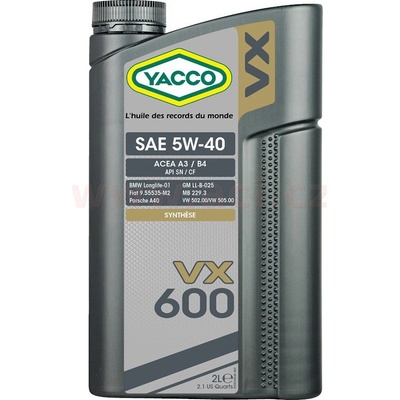 Plně syntetický motorový olej. YACCO VX 600 5W40 je vyvinutý pro benzínové motory, stejně jako naftové motory s turbodmychadlem a přímé vstřikování Common Rail (bez DPF)....