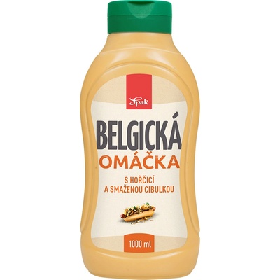 Belgická omáčka s hořčicí a smaženou cibulkou. Složení: pitná voda, řepkový olej, cukr, cibule, ocet kvasný lihový, 4% hořčice (pitná voda, semeno hořčice, ocet kvasný lihový,...