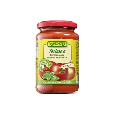 Rajčatová omáčka Toskana Ovocná jemná rajčatová omáčka s jemnou zeleninou a čerstvou bazalkou. Rajčata obsažená v této rajčatové omáčce jsou 100% z Itálie. Rapunzel podporuje...