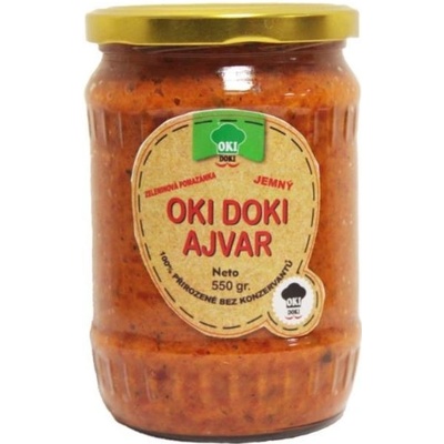 Makedonský ajvar, 100% bez konzervantů, jemný Složení: pečená paprika, pečený lilek, slunečnicový olej, sůl, cukr obsah neto: 550g Výrobce: OKI DOKI FOODS, Severní Makedonie