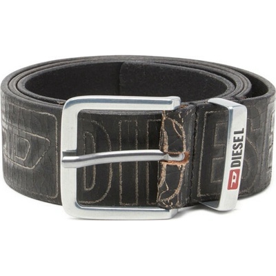Pánský opasek. Vyroben z pevné hovězí kůže. Celoplošně zdoben vylisovanými nápisy Diesel Industry Denim Division D. Černá matná přezka je originální obměnou klasické stříbrné přezky. Design je inspirován archivními modely pásků Diesel.