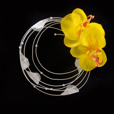 Rozměr: nastavitelný Připevnění na kapotu: 2 ks přísavky Materiál: pedig, textilní orchidej, perličky Na pedig je připevněna orchidej ve žluté barvě. Stočený pedig zdobí okvětní...