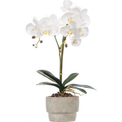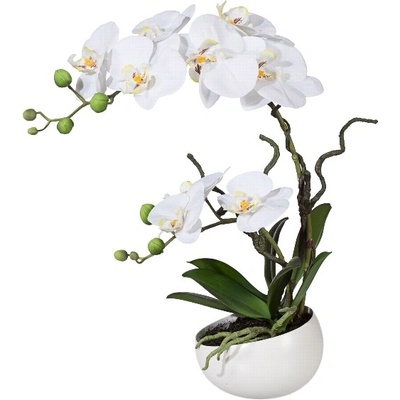 Luxusní umělá květina Orchidej má celkovou výšku včetně květináče 55cm a průměr rostliny je cca 25cm. Zelené listy a bílé květy jsou vyrobeny z materiálu PE. Umělou orchidej...