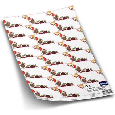 Samolepky na koření. Oválný tvar. 21 samolepek s popisem, 2 prázdné. Rozměry: 1 samolepka 4,3x2,2 cm, rozměr archu 14,3x21 cm.
