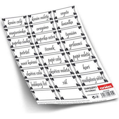 Samolepky na koření. Obdélníkový tvar. 21 samolepek s popisem, 2 prázdné. Rozměry: 1 samolepka 4,7x2,4 cm, rozměr archu 14,3x21 cm.