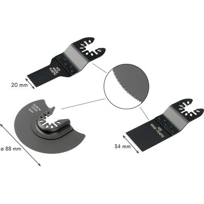 - sada nástrojů s univerzálním OIS upínáním pro oscilační brusky - 3 x plátek s vrstvou karbidu wolframu - vhodné pro řezání stavebních materiálů, obkladů, dlažby, čištění...