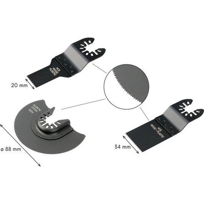 - sada tří nástrojů s univerzálním OIS upínáním pro oscilační brusky - HCS - vysokouhlíková ocel, vhodné pro řezání a ponorné řezání dřeva, plastů, sádrokartonu
