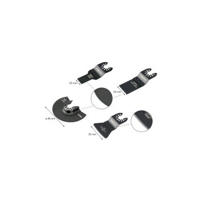 \nsada nástrojů s univerzálním OIS upínáním pro oscilační brusky\n 3 x plátek BiM - vhodné pro řezání a ponorné řezání kovu, tvrdého i měkkého dřeva, plastu, sádrokartonu,...