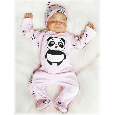 Měkká panenka miminko vypadá jako skutečná je oblečená v overaly s pandou + doplňky (plenka, láhev, dudlík).