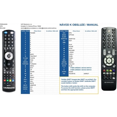 Náhrada originálního dálkového ovladače Ferguson RCU-540 (RCU540) Funkčnost ovladače stejná s originálem. Pro modely: Ariva 102E (od 2012), Ariva 102mini (od 2012), Ariva...