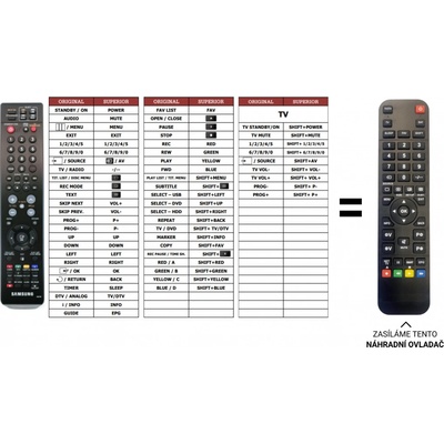 Náhradní dálkový ovladač pro DVD Samsung AK5900079B . DVDSH877/XEF, DVD-SH 873, DVD-VR320,VR355 DVD-VR320 DVD-V6700S DVD-V6800, DVD-SH875/EDC ORIGINÁL SE JIŽ NEDODÁVÁ. Návod je...
