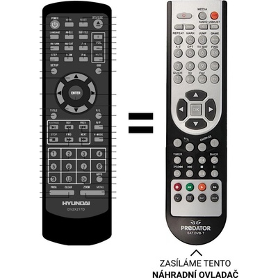 Náhradní dálkový ovladač pro DVD Hyundai DV2X279DU, DV2-X-227DU, DV2X227DU.DV2H369DU, DV2X227DU Má všechny funkce jako originál. Rozpis tlačítek je přiložen.