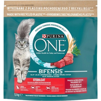 PURINA ONE STERILCAT SUCHÉ KRMIVO S HOVĚZÍM MASEM 1,5 kg Kompletní krmivo pro dospělé kočky Viditelné zdraví dnes i zítra PURINA ONE Sterilcat má přizpůsobený nutriční profil...