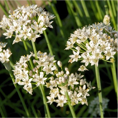 Česneko-pažitka. Vytrvalá bylina vysoká 35-50 cm. Kvete bílými hvězdicovitými květy. Ploché listy mají česnekové aroma. Seje se do sponu 20 - 30 x 20 cm po dvaceti semenech. Jak...