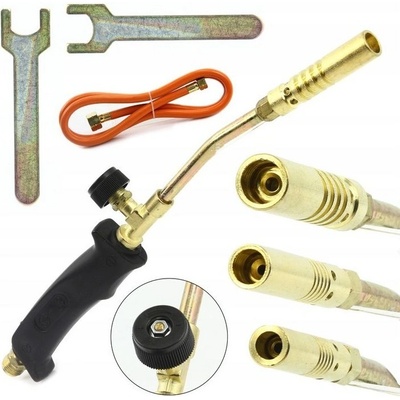 přesná regulace plynu, výměnné koncovky 13-17 mm, teplota plamene až 1850 °c, hadice 1,5 m, kovové části s plastovou rukojetí, vhodný pro pájení měděných trubek