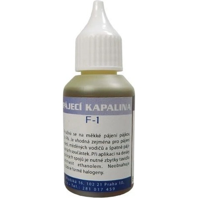 Pájecí kapalina F-1 od firmy ELCHEMCO je určena pro měkké pájení slitinou Sn-Pb, zejména při letování mědi a špatně pájitelných součástek. Po pájení je nutné odstranit zbytky ethanolem.