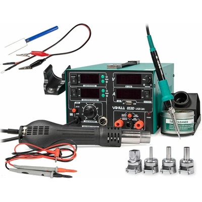 ⭐ Pájecí stanice 5v1 hot air hrotová napájecí zdroj RF měřič Yihua 853D 800W ⭐ Pájecí stanice Yihua 853D 1A 15V RF je skutečným mistrem mezi nástroji pro elektroniku. Vybavena pěti klíčovými moduly: 1 horkovzdušná páječka, 2 pájecí hroty, 3 servisní napájecí zdroje 1A...