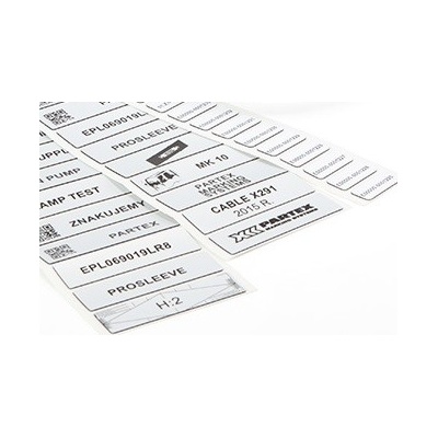 Náhrada gravírovaných štítků, lze je lehce popsat na termotransferových tiskárnách Lesklý, masivní štítek odolný proti odření, odolný vůči alkoholům, olejům a UV stabilní...