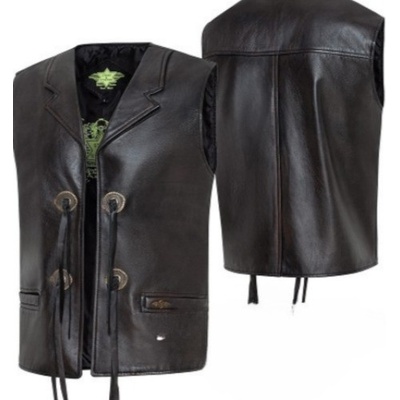 Klasická kožená vesta vyrobená z vysoce kvalitní jehněčí kůže. Vesta je zdobená čtyřmi conchas a má dvě vnější a jednu vnitřní kapsu.