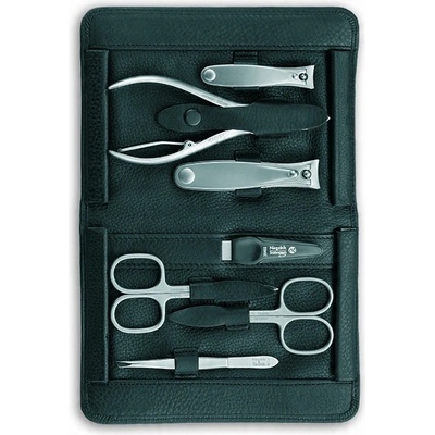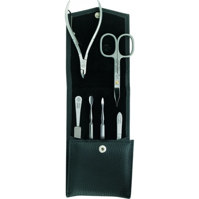 Pánská manikúrová sada v koženém pouzdře pro úpravu nehtů. Nástroje jsou vyrobeny z niklu.
