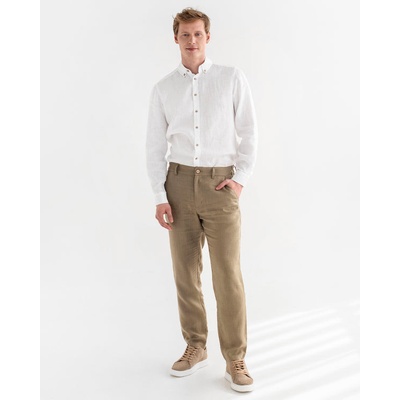 Světlé lněné odlehčené kalhoty ve střihu Chino ve volnějším rovném střihu. Mají klasické dvě přední a dvě zadní kapsy. Přední kapsy jsou zešikmené. Vyrobeny ze 100 lnu. Česká...