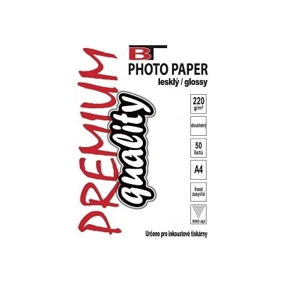 Premium BT photo papír A4 Vysoce kvalitní oboustranný fotopapír A4 220g/m2 lesklý - balení 50ks Papír umožňuje tisk i do vysokého rozlišení - až 9600dpi Inkoust na něm...