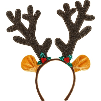 Vánoční čelenka se zdobenými sobími parohy. velikost čelisti: pro děti rozměr: 195 x 210 mm hmotnost: 20g materiál: 100% Polyester, PP Cena je za 1 kus.