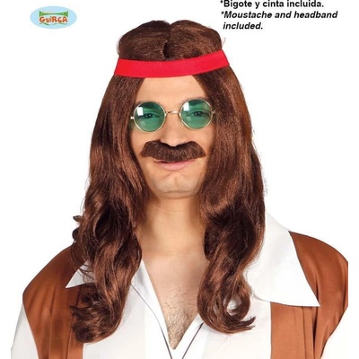 Klíčové vlastnosti produktu Hippies Paruka Hnědá a Knír s Čelenkou Paruka GUIRCA se hodí pro muže Dlouhé prameny Je zhotovena z umělých vlasů Doplní kostým ve stylu hippies Barva vlasů je hnědá