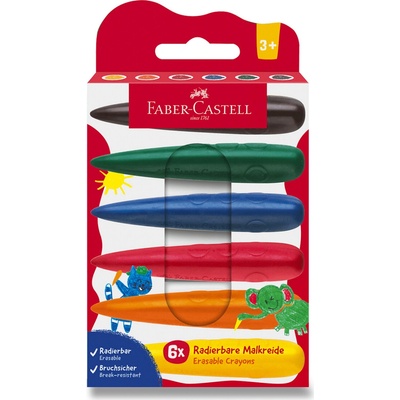 Faber-Castell Plastové pastelky 6ks Faber-Castell Plastové pastelky s ergonomickou oblastí úchopu do dlaně. Sada objehuje šest barevných pastelek (žlutou, oranžovou, červenou, zelenou, modrou a hnědou). gumovatelné neznečišťují ruce - vhodné pro malé děti od 4...