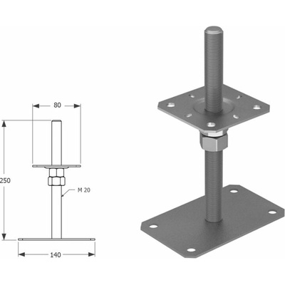 Patka pilíře stavitelná čtvercová je k dispozici v rozměru M20x140mm (min.výška), vrchní deska (80x80mm) a spodní deska (110x110mm), v povrchové úpravě: galvanický zinek.