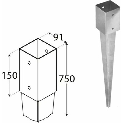 Patka sloupku 121x121x150mm/75cm tl. 1.8mm ZNRobustní patky sloupků pro zajištění trámu, žárově zinkovány pro zvýšení životnosti.