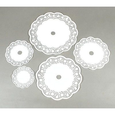 Sada dortových kulatých krajek v bílé barvě o průměrech Ø 200 / Ø 260 / Ø 320 mm vhodná zejména pro 3-patrový dortový stojan. V balení je každý z průměrů po 100 listech.