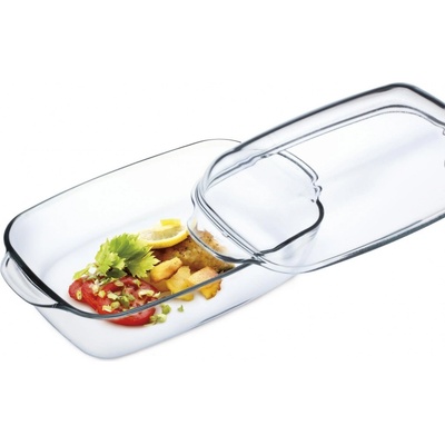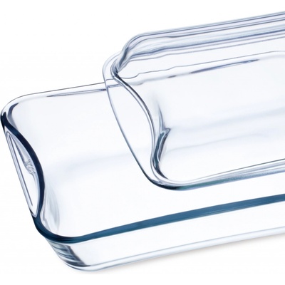 Hranatý skleněný pekáč z odolného skla vhodný na pečení i servírování pokrmů.