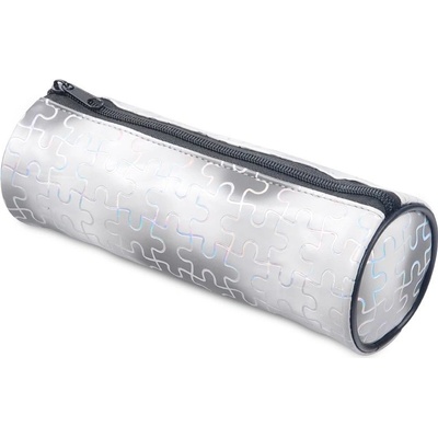 Školní penál/etue válcového tvaru v bílé barvě s černými okraji a zipem, přičemž povrch působí dojmem jemně batikovaného vzoru, který je doplněn stříbrnými holografickými dílky...