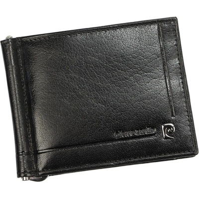 Černá kožená dolarovka Pierre Cardin. Uvnitř je 6 slotů na karty, 2 zastrkávací přihrádky na doklady a uprostřed spona na bankovky. .