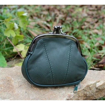 Dámská zelená malá peněženka na mince z kůže, případně různé drobnosti, ozdobně štepovaná, tmavé kování, dvě samostatné složky s kovovým uzávěrem a malá kapsa na zip. Do...