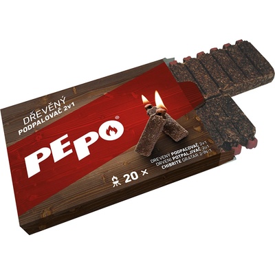 Pe-Po pevný podpalovač 2v1, 20 podpalů PE-PO dřevěný podpalovač 2v1, ve tvaru odlomitelných dílků, obsahuje lisované dřevěné piliny napuštěné parafínem a je na konci opatřen...