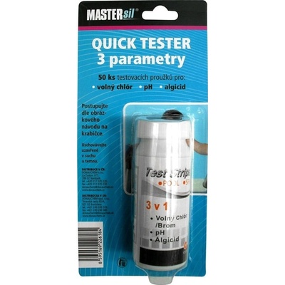Quick tester papírky 3 parametry MASTERSIL Jednoduchý proužkový testr pro měření obsahu chloru, alkality a pH v bazénové vodě. Obsah 50 papírků.