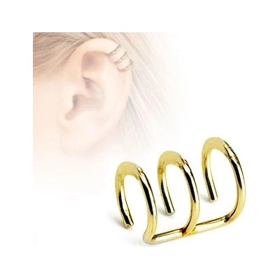 Fake piercing do chrupavky ucha - trojitý kroužek zlaté barvy, chirurgická ocel 316L, lesklý povrch.