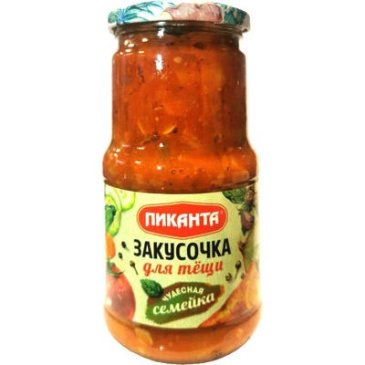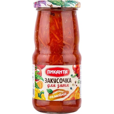 Zeleninová svačinka „Zakusočka pro zetě“ 460 g Pikanta Sladká bulharská paprika a křupavá mrkev v bohaté rajčatové omáčce – skvělý doplněk k příloze, ale také lehká samostatná svačinka. Složení: sladká paprika, mrkev, rajčatový protlak, cukr, sůl, kukuřičný škrob,...