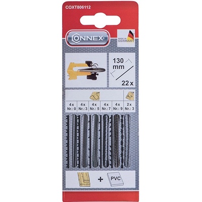 (22 strojních pilových listů), na dřevo a plast, 5 typů pro přímé řezy a oblouky, 1 typ pro všesměrové řezání.
