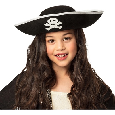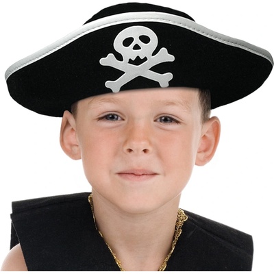 Černý dětský pirátský klobouk s bílým symbolem lebky a bílým lemem. Klasický klobouk pro dětskou pirátskou párty. 0bvod hlavy: 55 cm Materiál: 90% polyester, 5%...