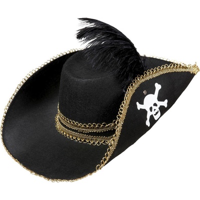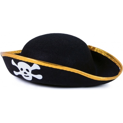 Krásný klobouk jako pro opravdové piráty! Tento černý elegán o průměru 20cm je určen pro dospělé nebo starší děti a je zdoben zlatým lemováním. Perfektní doplněk ke kostýmu...