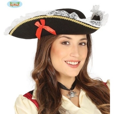 Dámský třírohý karnevalový klobouk s bílou krajkou a ozdobnou mašlí. Ideální na karneval, maškarní, oslavy a párty v pirátském stylu.